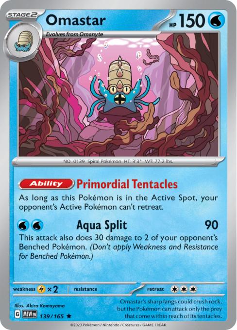 Omastar's sharp fangs could crush rock, but the Pokémon can attack only the prey that come within reach of its tentacles.