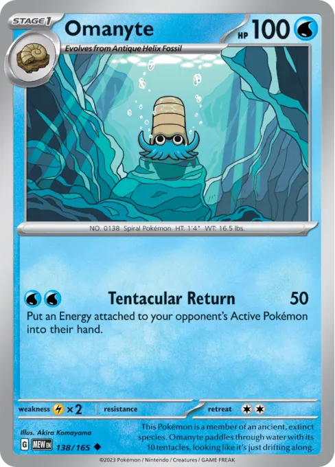 This Pokémon is a member of an ancient, extinct species. Omanyte paddles through water with its 10 tentacles, looking like it's just drifting along.