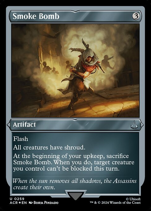 At the beginning of your upkeep, sacrifice Smoke Bomb. When you do, target creature you control can't be blocked this turn.