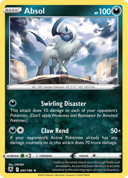 Swift as the wind, Absol races through fields and mountains. Its curved, bow-like horn is acutely sensitive to the warning signs of natural disasters.