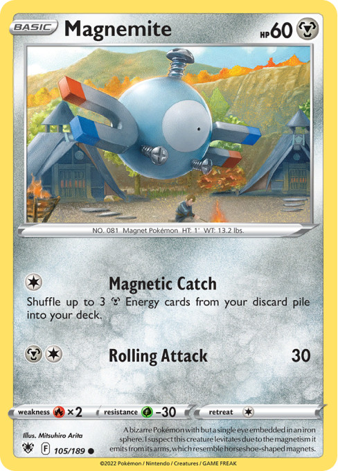 A bizarre Pokémon with but a single eye embedded in an iron sphere. I suspect this creature levitates due to the magnetism it emits from its arms, which resemble horseshoe-shaped magnets.