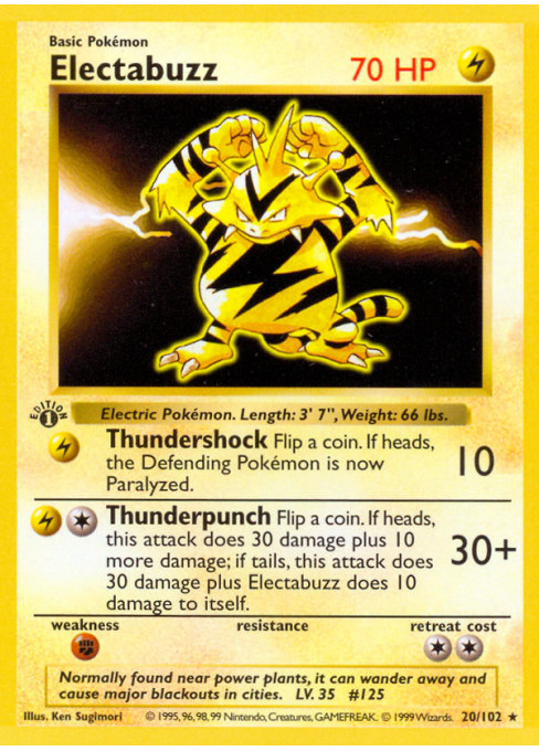 Flip a coin. If heads, this attack does 30 damage plus 10 more damage; if tails, this attack does 30 damage plus Electabuzz does 10 damage to itself.