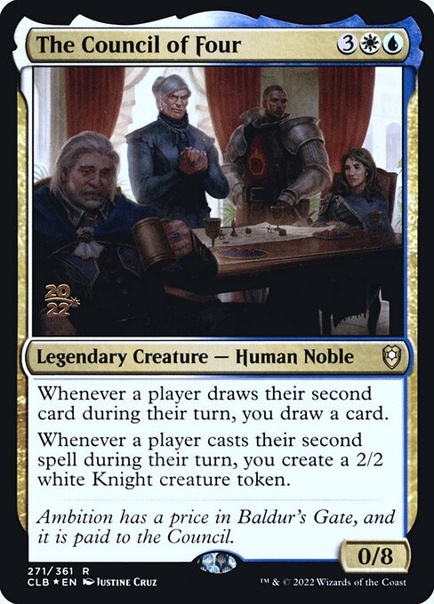 Whenever a player casts their second spell during their turn, you create a 2/2 white Knight creature token.
