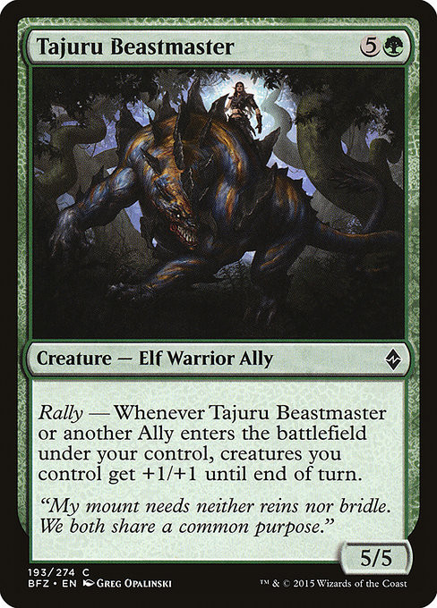Rally — Whenever Tajuru Beastmaster or another Ally you control enters, creatures you control get +1/+1 until end of turn.