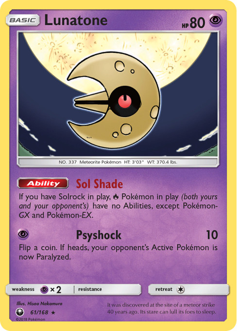 If you have Solrock in play, Fire Pokémon in play (both yours and your opponent's) have no Abilities, except Pokémon-GX and Pokémon-EX.