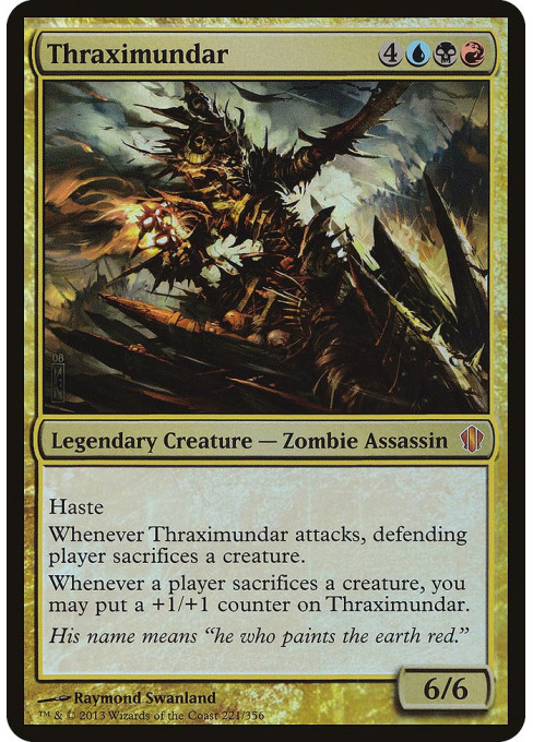 Whenever a player sacrifices a creature, you may put a +1/+1 counter on Thraximundar.
