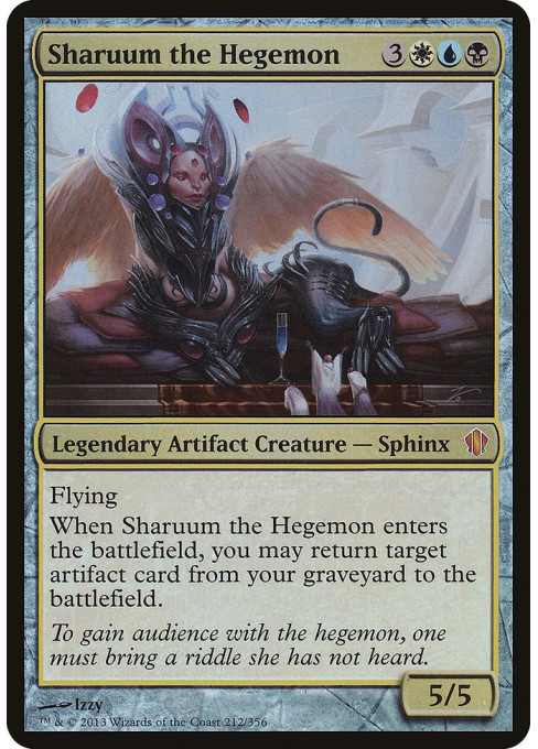 When Sharuum the Hegemon enters, you may return target artifact card from your graveyard to the battlefield.