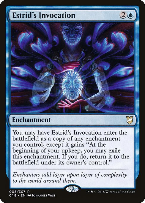 You may have Estrid's Invocation enter as a copy of an enchantment you control, except it has "At the beginning of your upkeep, you may exile this enchantment. If you do, return it to the battlefield under its owner's control."