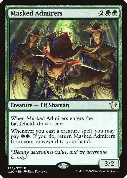 Whenever you cast a creature spell, you may pay . If you do, return Masked Admirers from your graveyard to your hand.