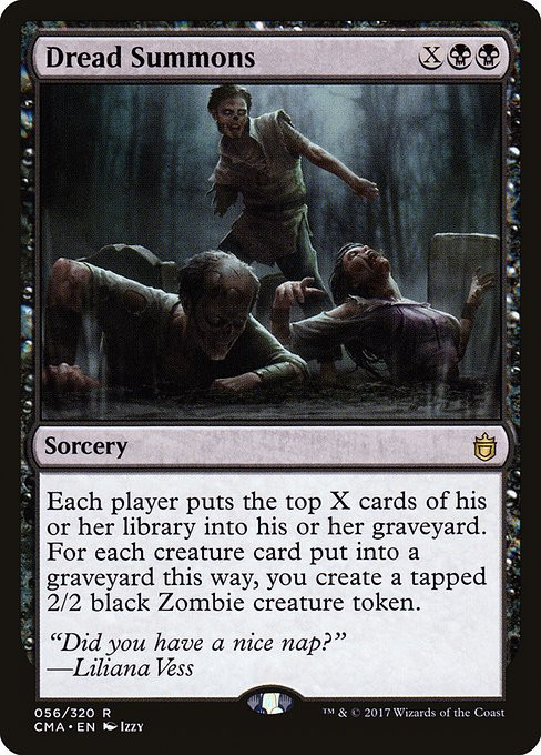 Each player mills X cards. For each creature card put into a graveyard this way, you create a tapped 2/2 black Zombie creature token. (To mill a card, a player puts the top card of their library into their graveyard.)