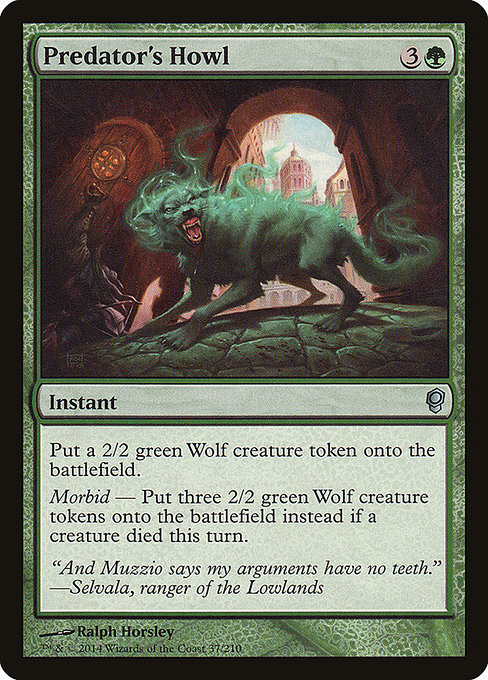 Morbid — Create three 2/2 green Wolf creature tokens instead if a creature died this turn.