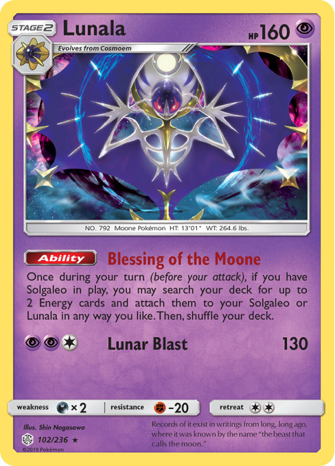 Once during your turn (before your attack), if you have Solgaleo in play, you may search your deck for up to 2 Energy cards and attach them to your Solgaleo or Lunala in any way you like. Then, shuffle your deck.