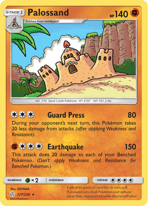 Each of its grains of sand has its own will. Palossand eats small Pokémon and siphons away their vital essence while they're still alive.