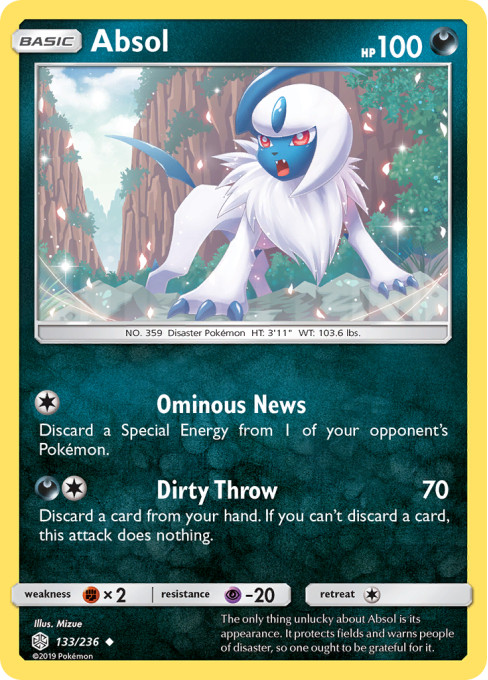 The only thing unlucky about Absol is its appearance. It protects fields and warns people of disaster, so one ought to be grateful for it.