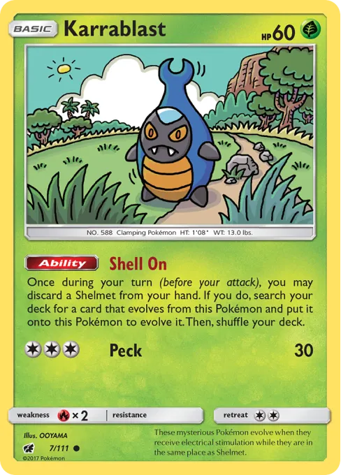 Once during your turn (before your attack), you may discard a Shelmet from your hand. If you do, search your deck for a card that evolves from this Pokémon and put it onto this Pokémon to evolve it. Then, shuffle your deck.