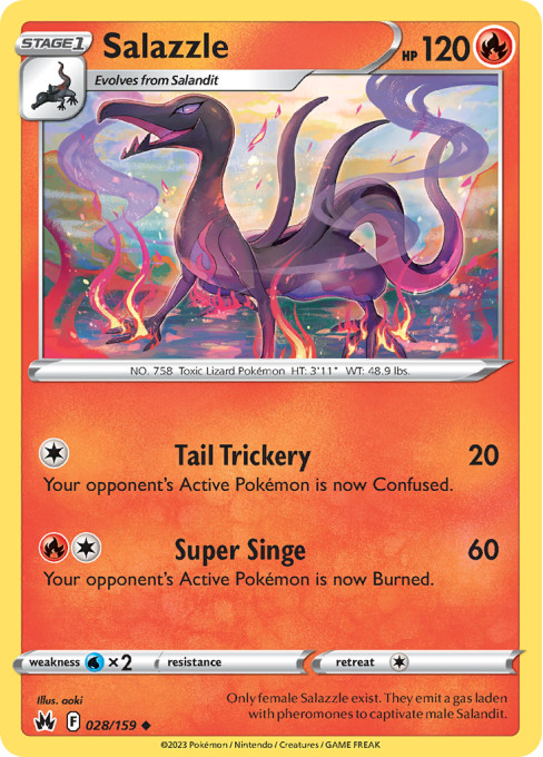 Only female Salazzle exist. They emit a gas laden with pheromones to captivate male Salandit.