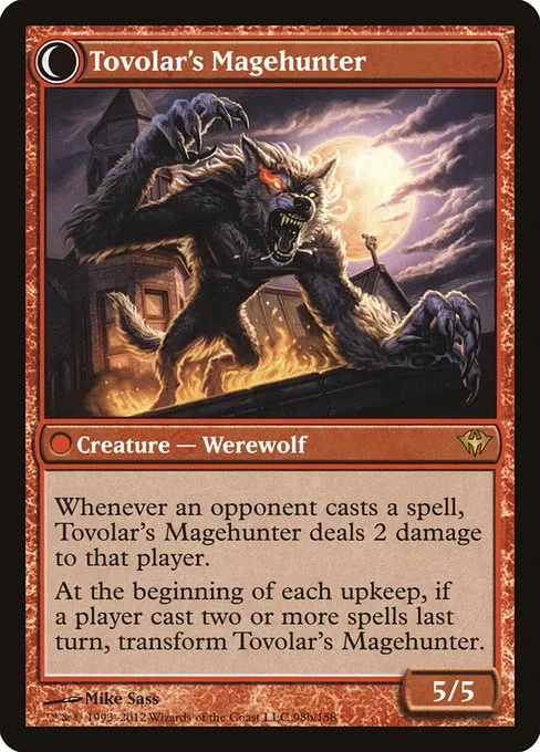 At the beginning of each upkeep, if a player cast two or more spells last turn, transform Tovolar's Magehunter.