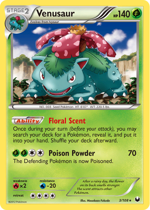 After a rainy day, the flower on its back smells stronger. The scent attracts other Pokémon.