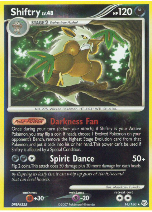 Once during your turn (before your attack), if Shiftry is your Active Pokémon, you may flip a coin. If heads, choose 1 Evolved Pokémon on your opponent's Bench, remove the highest Stage Evolution card from that Pokémon, and put it back into his or her hand. This power can't be used if Shiftry is affected by a Special Condition.