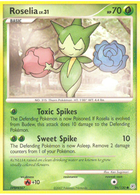 The Defending Pokémon is now Poisoned. If Roselia is evolved from Budew, this attack does 10 damage to the Defending Pokémon.