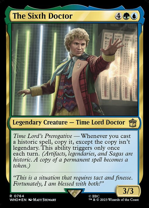 Time Lord's Prerogative — Whenever you cast a historic spell, copy it, except the copy isn't legendary. This ability triggers only once each turn. (Artifacts, legendaries, and Sagas are historic. A copy of a permanent spell becomes a token.)