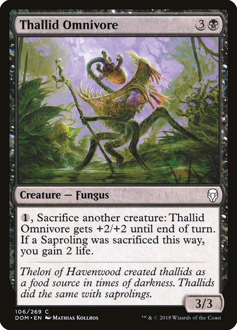 , Sacrifice another creature: Thallid Omnivore gets +2/+2 until end of turn. If a Saproling was sacrificed this way, you gain 2 life.