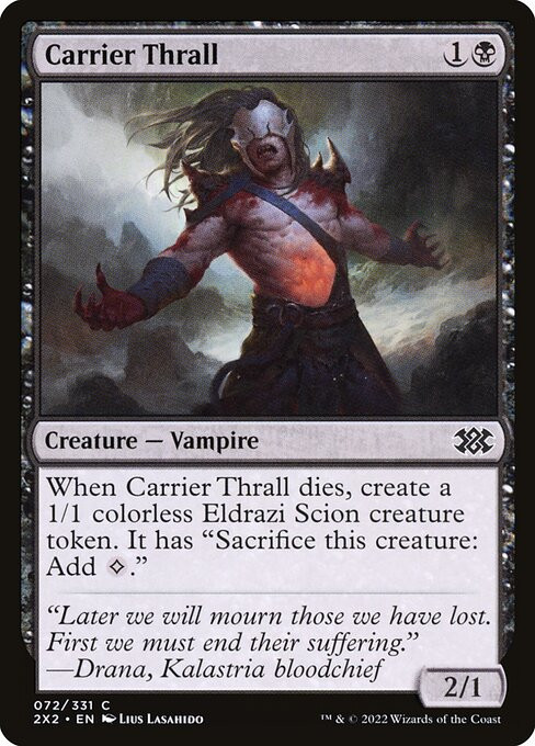 When Carrier Thrall dies, create a 1/1 colorless Eldrazi Scion creature token. It has "Sacrifice this creature: Add ."
