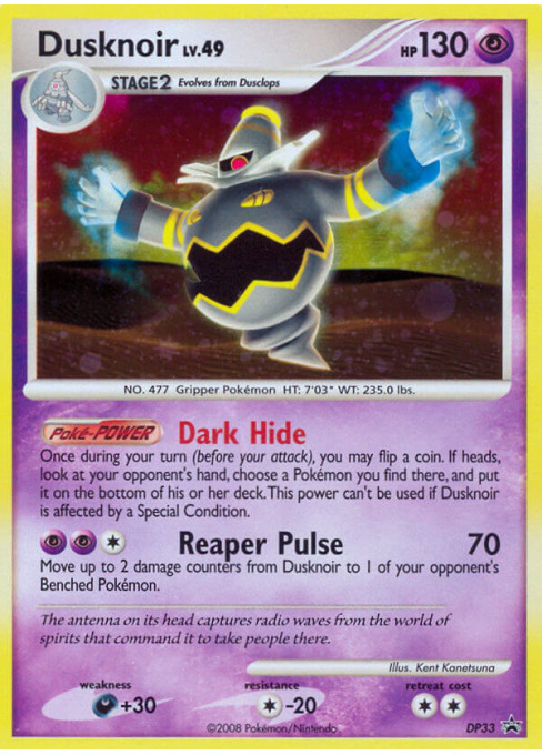 Once during your turn (before your attack), you may flip a coin. If heads, look at your opponent's hand, choose a Pokémon you find there, and put it on the bottom of his or her deck. This power can't be used if Dusknoir is affected by a Special Condition.