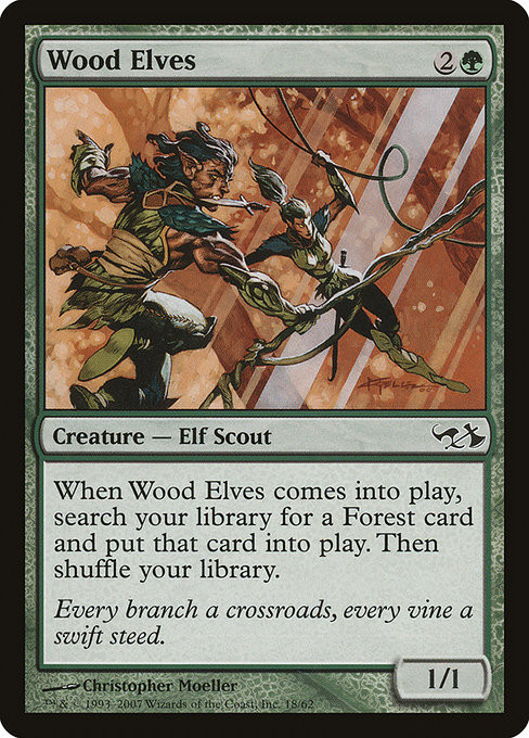 When Wood Elves enters, search your library for a Forest card, put that card onto the battlefield, then shuffle.
