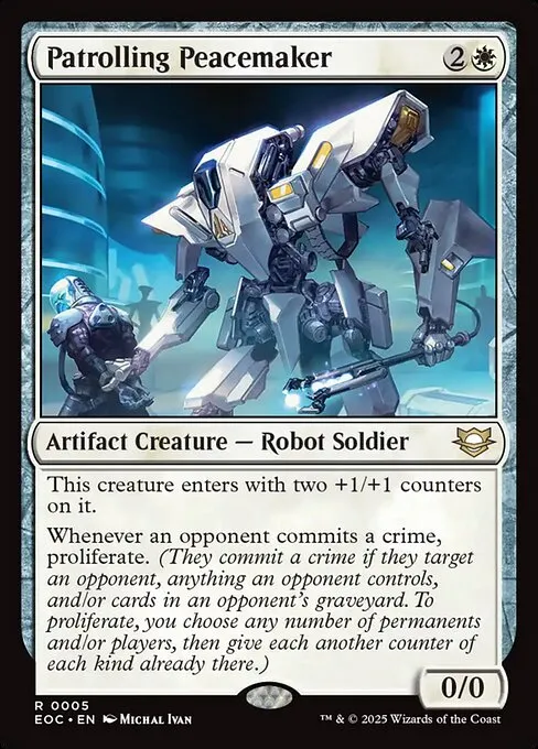 Whenever an opponent commits a crime, proliferate. (They commit a crime if they target an opponent, anything an opponent controls, and/or cards in an opponent's graveyard. To proliferate, you choose any number of permanents and/or players, then give each another counter of each kind already there.)