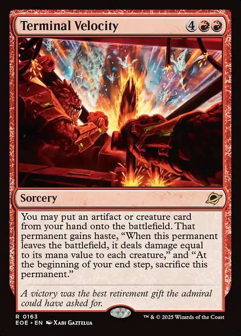 You may put an artifact or creature card from your hand onto the battlefield. That permanent gains haste, "When this permanent leaves the battlefield, it deals damage equal to its mana value to each creature," and "At the beginning of your end step, sacrifice this permanent."