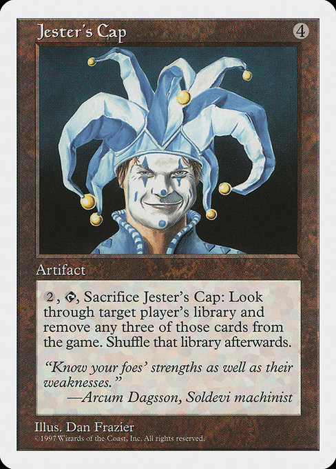 , , Sacrifice Jester's Cap: Search target player's library for three cards and exile them. Then that player shuffles.