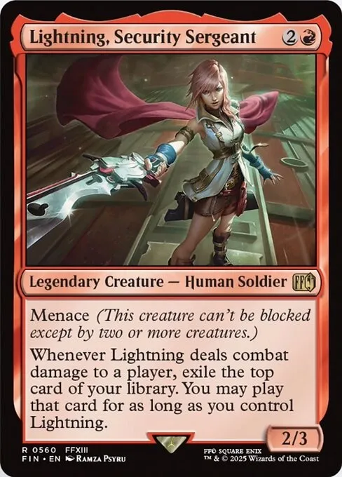 Whenever Lightning deals combat damage to a player, exile the top card of your library. You may play that card for as long as you control Lightning.
