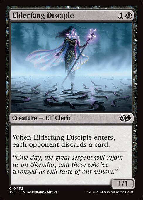 When Elderfang Disciple enters, each opponent discards a card.