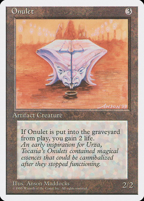 "An early inspiration for Urza, Tocasia's Onulets contained magical essences that could be cannibalized after they stopped functioning."
