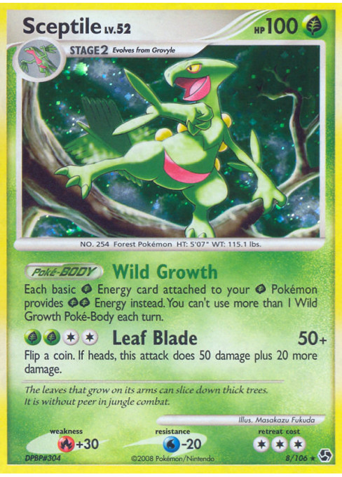 Each basic Grass Energy card attached to your Grass Pokémon provides GrassGrass Energy instead. You can't use more than 1 Wild Growth Poké-Body each turn.