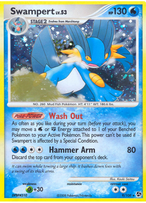 As often as you like during your turn (before your attack), you may move a Water or Fighting Energy attached to 1 of your Benched Pokémon to your Active Pokémon. This power can't be used if Swampert is affected by a Special Condition.