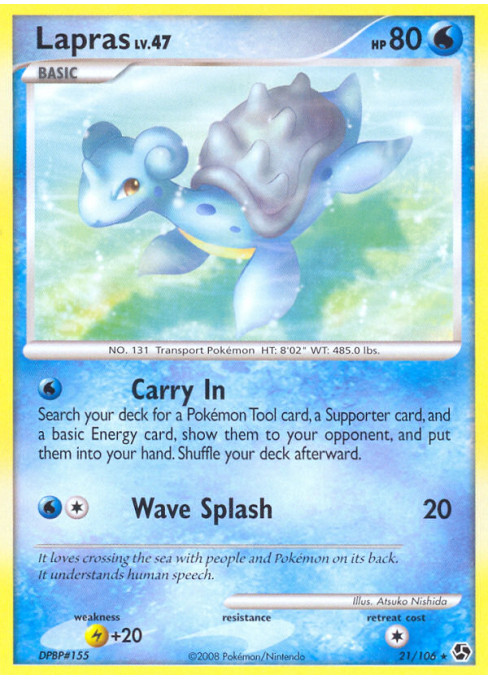 It loves crossing the sea with people and Pokémon on its back. It understands human speech.