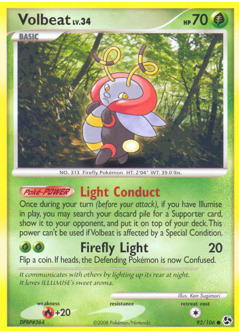Once during your turn (before your attack), if you have Illumise in play, you may search your discard pile for a Supporter card, show it to your opponent, and put it on top of your deck. This power can't be used if Volbeat is affected by a Special Condition.