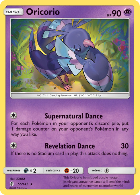 This Oricorio has sipped purple nectar. Its elegant, attractive dance will send the minds and hearts of its enemies to another world.