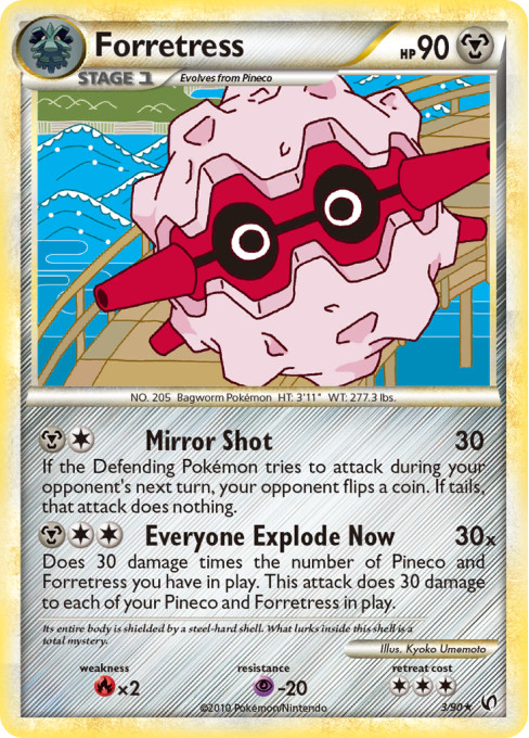 Does 30 damage times the number of Pineco and Forretress you have in play. This attack does 30 damage to each of your Pineco and Forretress in play.