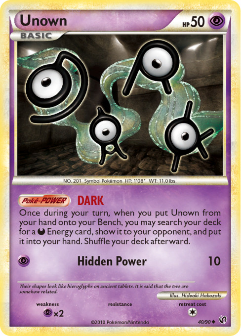 Once during your turn, when you put Unown from your hand onto your Bench, you may search your deck for a Darkness Energy card, show it to your opponent, and put it into your hand. Shuffle your deck afterward.