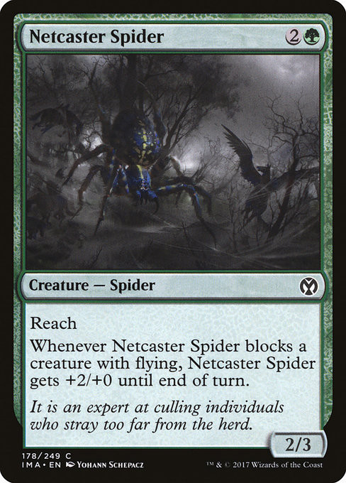 Whenever Netcaster Spider blocks a creature with flying, Netcaster Spider gets +2/+0 until end of turn.