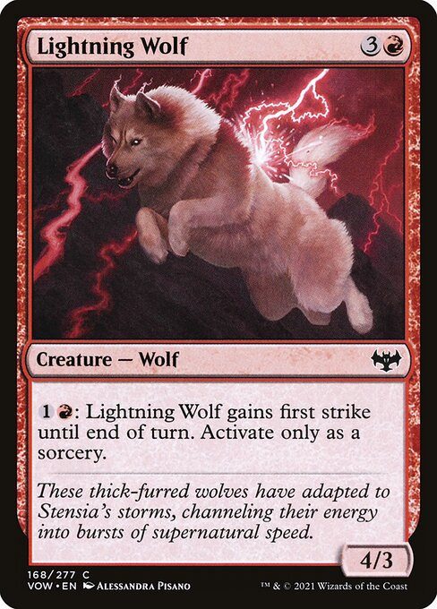 "These thick-furred wolves have adapted to Stensia's storms, channeling their energy into bursts of supernatural speed."