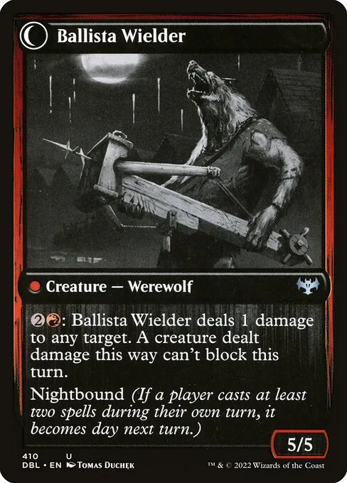 : Ballista Wielder deals 1 damage to any target. A creature dealt damage this way can't block this turn.