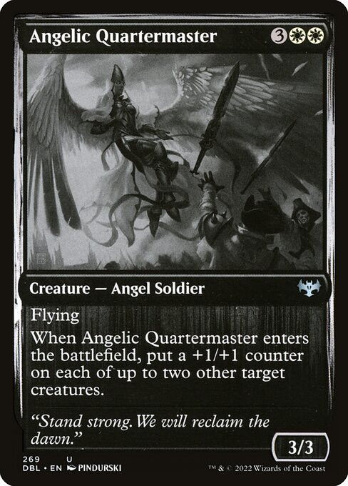 When Angelic Quartermaster enters, put a +1/+1 counter on each of up to two other target creatures.