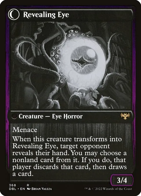 When this creature transforms into Revealing Eye, target opponent reveals their hand. You may choose a nonland card from it. If you do, that player discards that card, then draws a card.