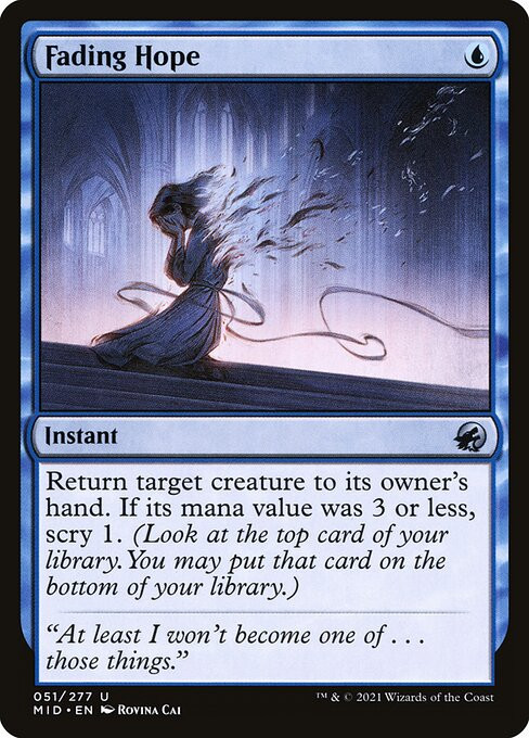Return target creature to its owner's hand. If its mana value was 3 or less, scry 1. (Look at the top card of your library. You may put that card on the bottom.)