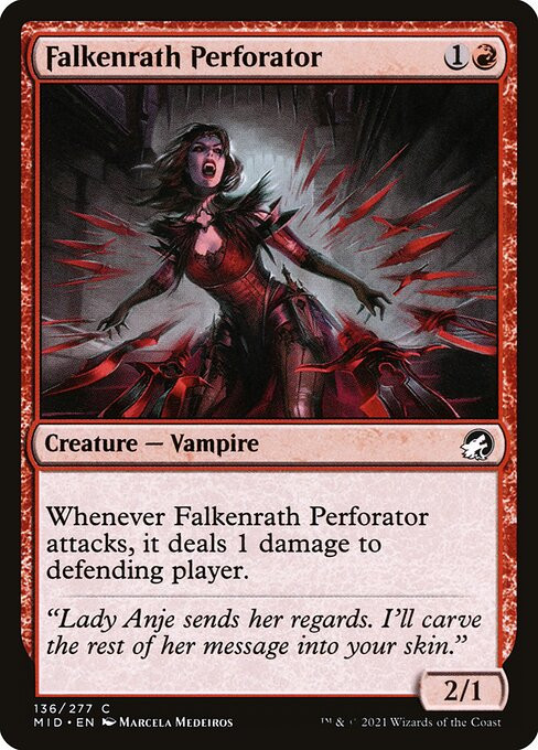 Whenever Falkenrath Perforator attacks, it deals 1 damage to defending player.