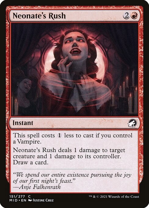 Neonate's Rush deals 1 damage to target creature and 1 damage to its controller. Draw a card.
